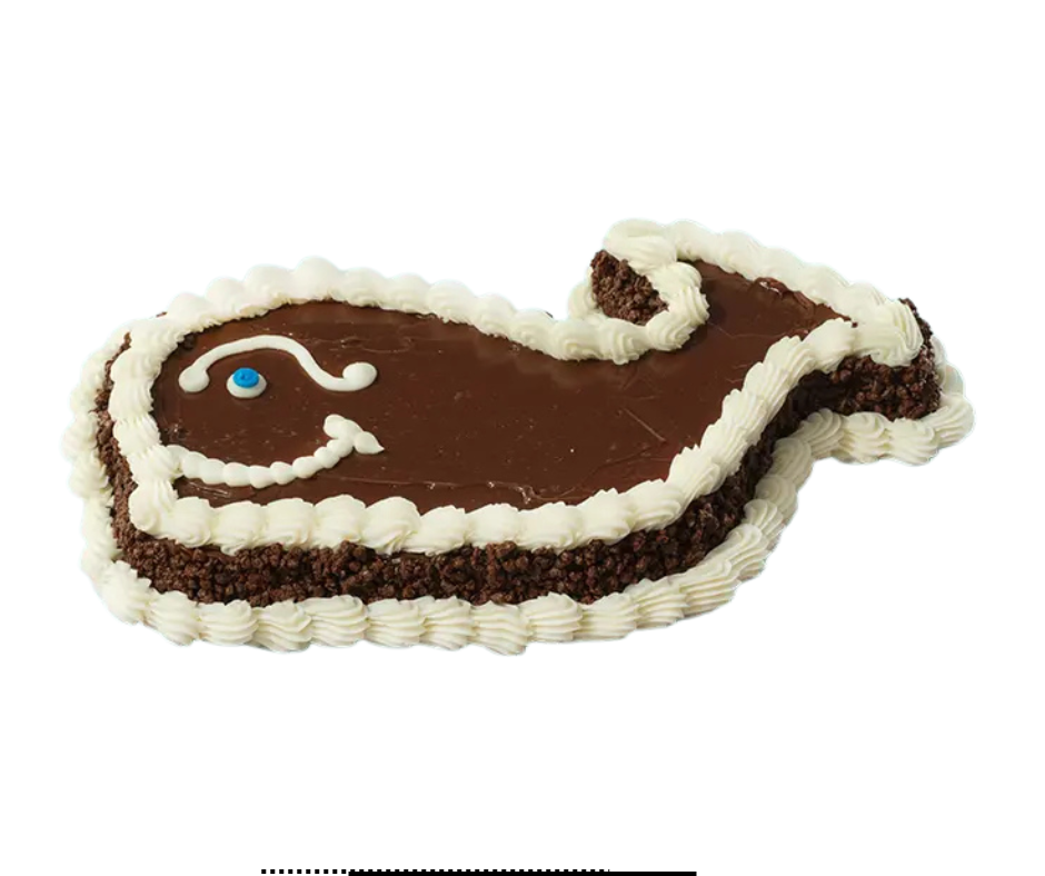 Fudgie the Whale Cake is a famous ice cream cake created by the American ice cream brand Carvel. It’s shaped like a cartoon whale and is made with layers of chocolate and vanilla ice cream, chocolate cookie crunchies, and whipped icing.